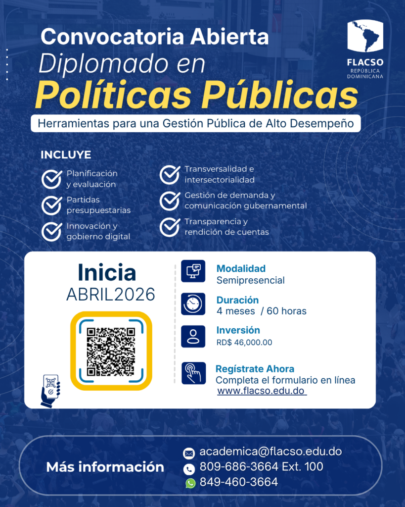FLACSO República Dominicana anuncia la apertura de inscripciones para el Diplomado en Políticas Públicas: Herramientas para una Gestión Pública de Alto Desempeño, una propuesta formativa de vanguardia diseñada para fortalecer las capacidades técnicas en la gestión pública contemporánea.